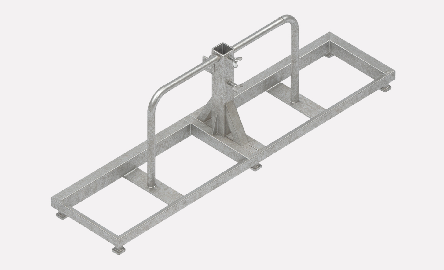 Robust highway-standard sign holder for 40 × 40 mm and 60 × 60 mm tubes, secured with two adjusting screws. Features a foldable vertical tube, safety hoops, and stable 4-point base for easy transport and safe use.